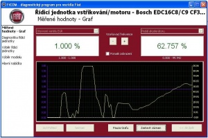 Režim měřených hodnot „Graf“ zobrazuje vždy 2 průběhy signálů v podobě přes sebe vykreslených křivek, Křivky jsou vykreslovány v rámci společné časové základny a podle toho jak jsou vybrány ze seznamu. Nad rastrem grafu jsou dvě bíla okna, ve kterých program zobrazuje měřenou hodnotu vyjádřenou příslušnou fyzikální veličinou nebo měrnou jednotkou. Pod tímto oknem se nacházejí podrobnější informace o minimální a maximální hodnotě, které je možné v daném kanálu hodnoty změřit. Tlačítko [Pauza Grafu] pozastaví aktuálně snímaný graf. Tlačítkem [<< Jdi Zpět] se vrátíte do okna diagnostika řídící jednotky.