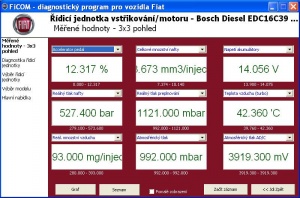 Funkce měřené hodnoty dovoluje sledovat všechny dostupné hodnoty měřené řídící jednotkou ze snímačů v reálném čase. Pro efektivnější analýzu sledovaných dat nabízí funkce měřených hodnot tři režimy zobrazení. Grafický (Obr. 63), Pohled 3x3 (Obr. 65) a Seznam (Obr. 66). Zobrazovaná data se mění od řídící jednotky k řídící jednotce, podle modelu a roku výroby. Některé ECU nedisponují funkcí měřených hodnot vůbec. Program FiCOM se snaží příchozí data z řídící jednotky co možná nejvěrněji zpracovávat, nicméně nemusejí být vždy přesná. Jedná se o omezené schopnosti řídící jednotky, nikoliv diagnostického systému FiCOM. Pokud si nejste jisti interpretovanou hodnotou, ověřte ji nástrojem paralelní diagnostiky. Použití funkce měřených hodnot je naprosto bezpečné, bez obav můžete prozkoumat řídící jednotku všemi třemi režimy a skupinami hodnot, nemůžete tím způsobit žádnou škodu.